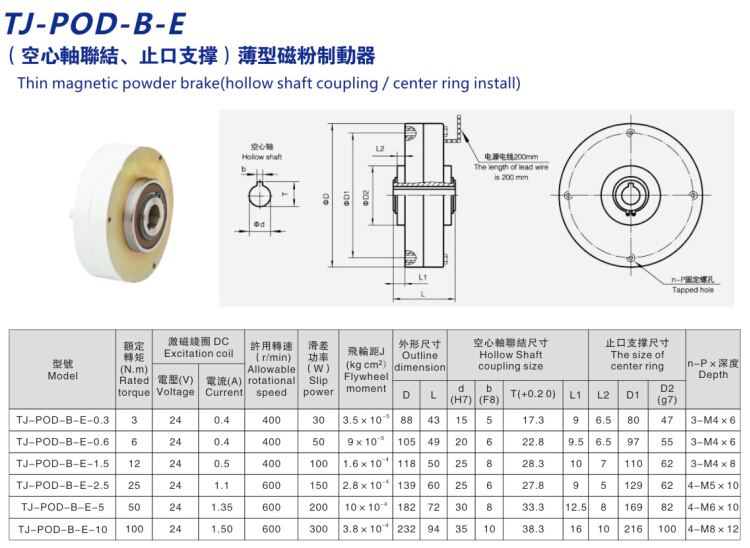 超薄型空心磁粉制動器剎車器額定電壓為DC24V,